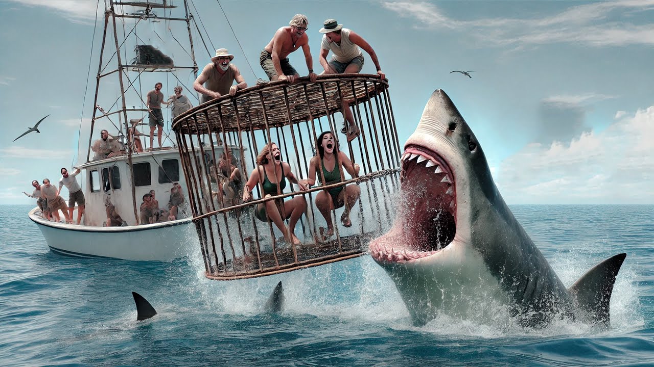 tubarão furioso devora um outro membro da equipe com uma abocanhada só e em seguida parte brutalmente o outro ao meio nesse momento adil e Sofia conseguem chegar ao barco virado e subir nele procurando o mínimo de Segurança ao menos quando então Eles veem o tubarão passar indo para onde estão os nadadores sendo atraída pelo barulho do bater de pernas e braços deles a criatura arrasta consigo a rede guia da competição fazendo assim sua localização ser notória com isso adil e Sofia decidem seguir o animal para de alguma forma avisar todos os nadadores sobre o Terrível