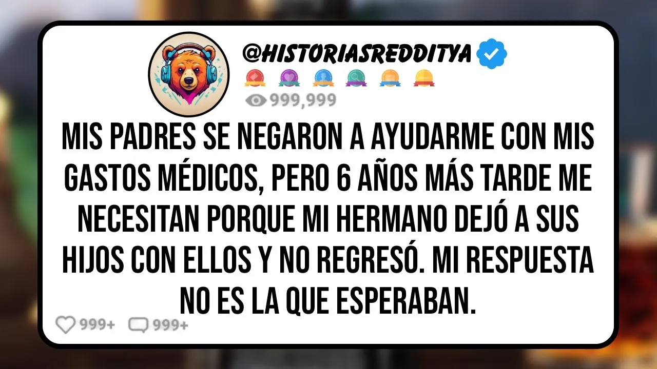 mis padres se negaron a ayudarme con mis gastos médicos pero 6 años más tarde me necesitan porque mi hermano dejó a sus hijos con ellos y no Regresó mi respuesta no es la que esperaban yo de 31 años no he tenido contacto con mis padres desde hace Casi 6 años después de ser diagnosticado con diabetes tipo do les pedí que me ayudaran con el costo de mis medicamentos porque mi seguro no cubría todo pero se negaron en ese momento estaba entre trabajos y tenía poco dinero y todos saben lo caros que son los medicamentos pero