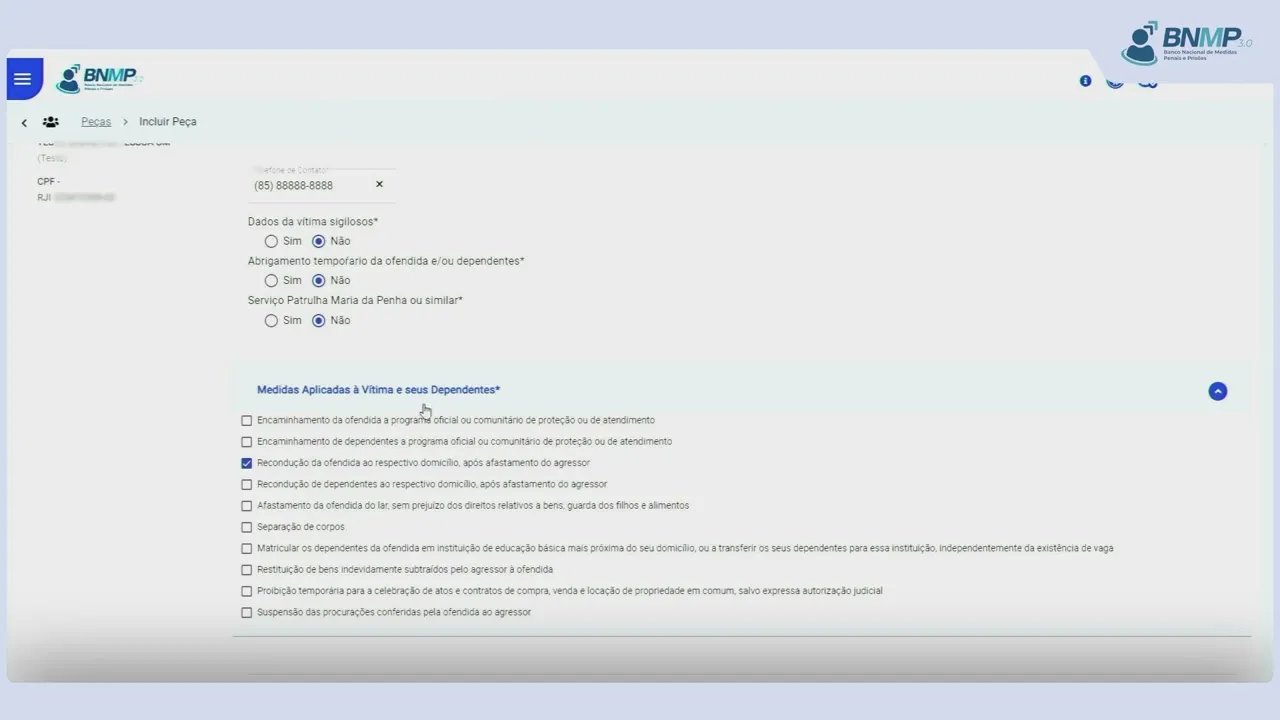 processo [Música] correspondente Verifique o motivo da expedição o número do processo a data de expedição selecione a classe [Música] verifique se a data da decisão está correta e se há necessidade de alteração nas datas início do período de comprimento da medida e fim do período de comprimento da medida após clique no botão próximo na aba dados da vítima e dos dependentes nas medidas protetivas de urgência Verifique se os campos dados da vítima sigilosos abrigamento temporário da ofendida e ou dependentes e serviço Patrulha Maria da Penha ou similar estão marcados corretamente no checkbox medidas aplicadas À