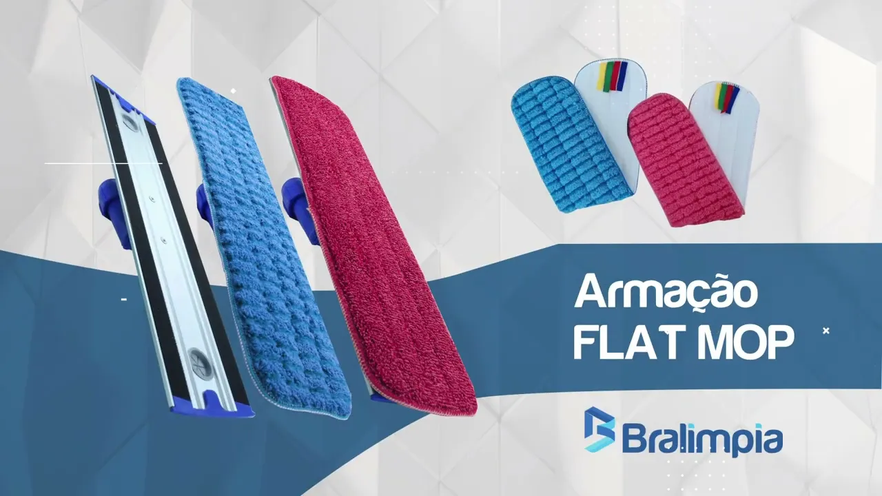A armação flat Mop bralimpia a solução perfeita para facilitar a limpeza umidade pisos e superfícies em geral resultado superior na limpeza com importantes diferenciais economia de água uso racional de químicos maior área de limpeza perfeita ergonomia uma resistente Armação em alumínio conjunto articulada para fixar refis em microfibra sua base conta com poderosas dos velcros para fixar os refis e exercer pressão constante aplicando a solução limpadora e retirando partículas aderidas as sujidades pó e poeira utilizada com os cabos bralimpia que possuem 1,40 de altura do sistema de rosca e trava proporcionar conforto aos operadores gerando maior