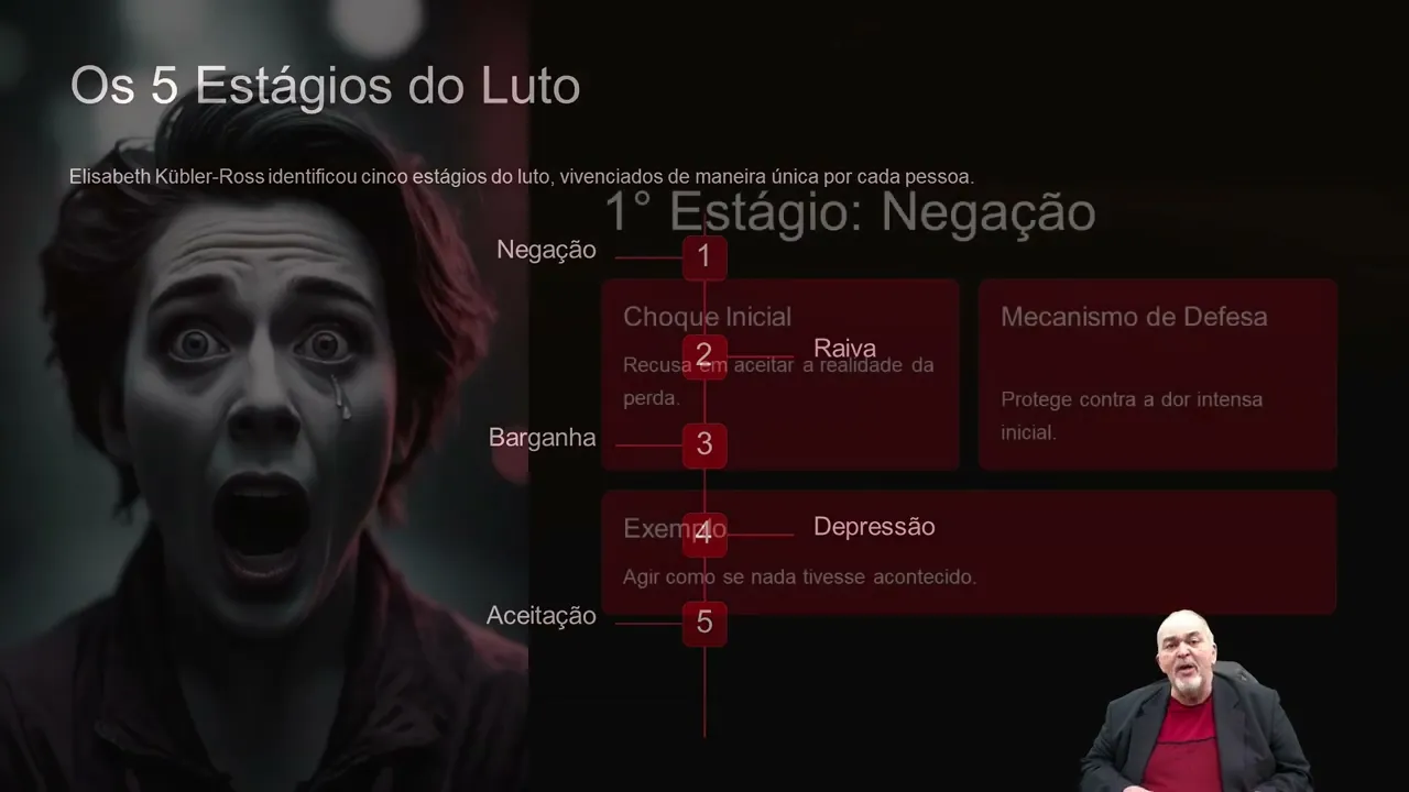 identificou cinco estágios do luto que estão vivenciados de maneira única por cada pessoa Primeiro estágio do luto negação Este é o choque inicial diante da perda A pessoa pode se recusar a aceitar a realidade como mecanismo de defesa para lidar com a dor intensa O exemplo prático Alguém que perde um familiar pode continuar agindo como se nada tivesse acontecido evitando falar sobre o assunto Segundo estágio do luto raiva Após a negação surgem sentimentos de revolta e injustiça A pessoa pode culpar a si mesma outras pessoas ou até a Deus pela perda O exemplo prático disto