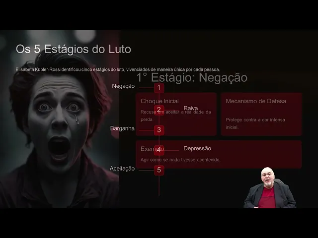 estoicismo ensinam a aceitá-la com serenidade Tenhamos o exemplo prático Em algumas culturas como no México a morte é celebrada com festivais no dia chamado dia dos mortos enquanto em outras como no Japão a despedida dos entes queridos segue rituais silenciosos e respeitosos Uma dica prática: pesquise sobre como diferentes culturas encaram a morte e reflita como isso influencia suas próprias crenças Neste momento vamos ver os cinco estágios do luto Uma rota necessária Independentemente da crença religiosa ou cultural a perda de um ente querido causa sofrimento e exige um processo de adaptação emocional A psicóloga Elizabeth Ross