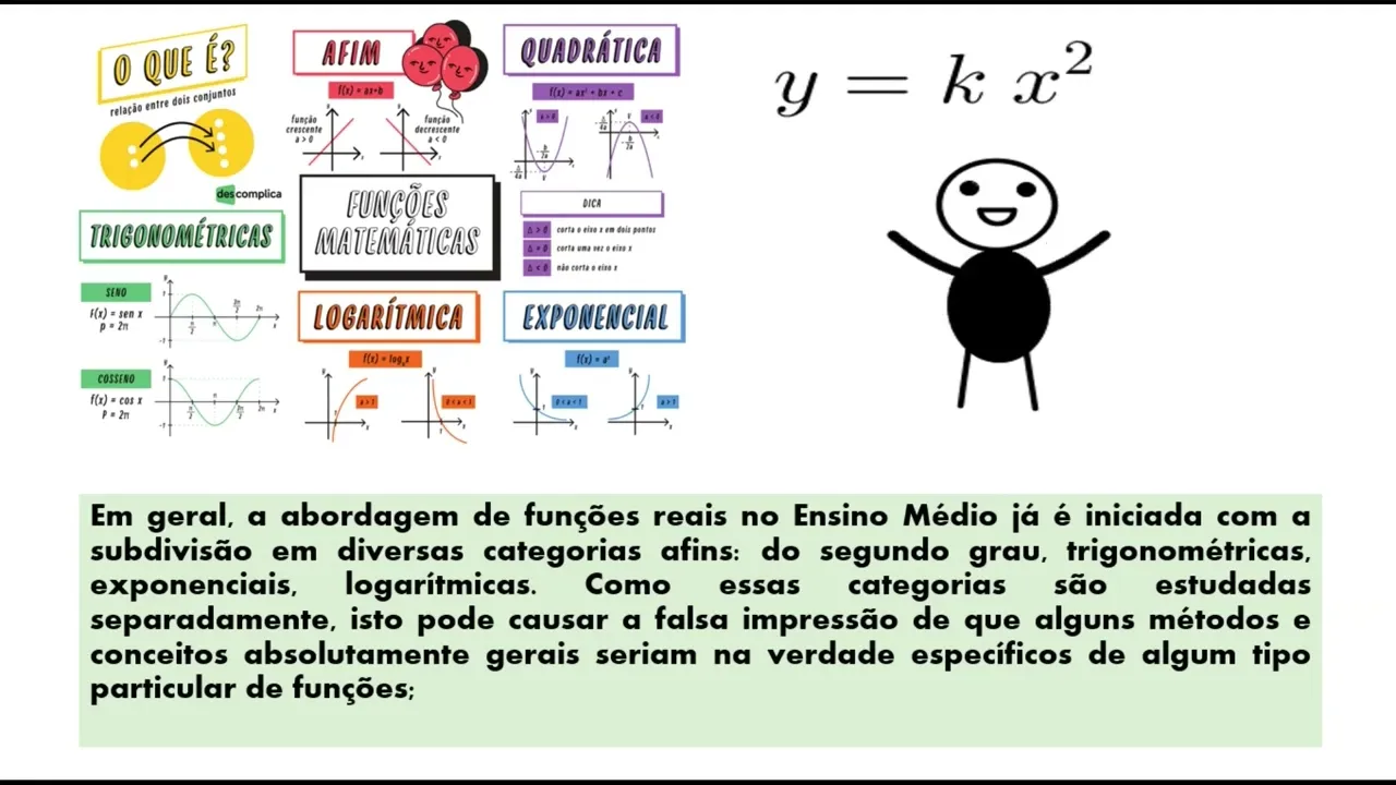 algumas confusões alguns erros que a gente vai ter posteriormente outro erro muito comumente né nos livros né mas é a nossa estrutura estrutura que a gente tem e que se consolidou né nos nossos livro didático é a ideia de que a gente precisa churrasco funções de maneira de detalhado separada e claro que é interessante estudar a cada uma com suas propriedades mas em é importante salientar posição antes que tudo é função não são tudo ali a função né e me geral essa abordagem Ensino Médio já iniciada com essa sombra divisão né dessas categorias né é