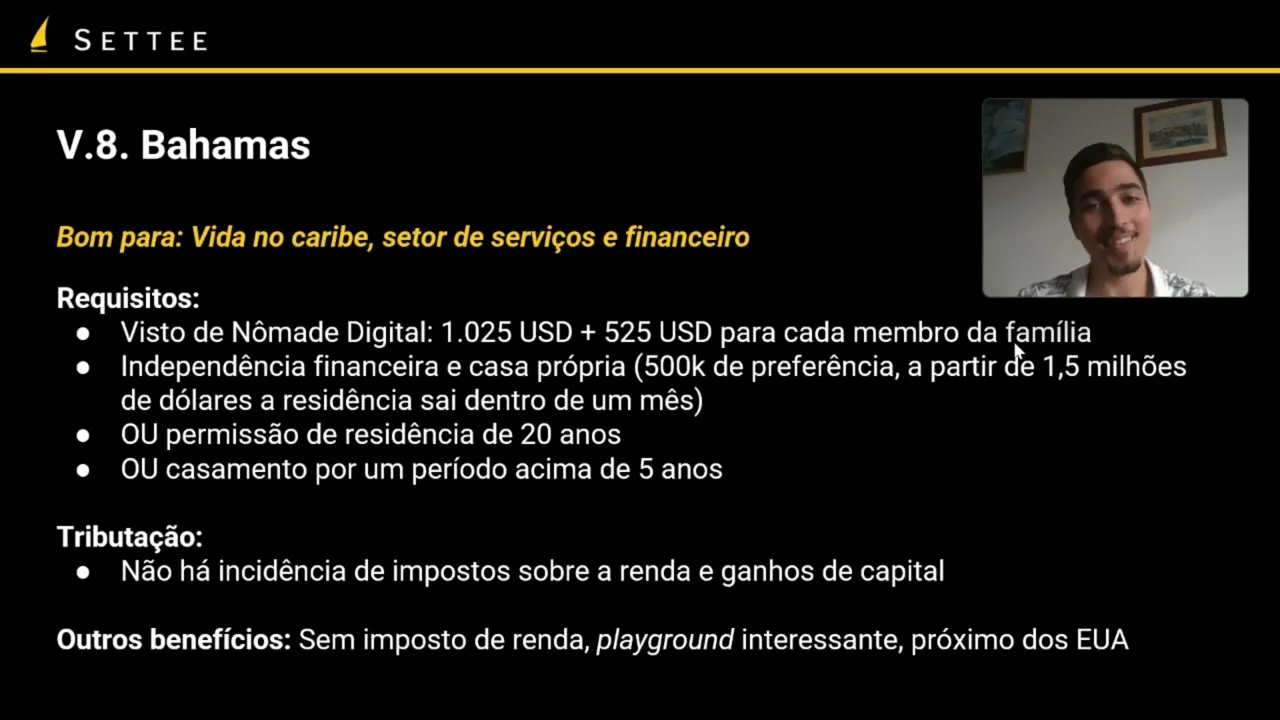 caso as Bahamas você tem duas principais opções de residência uma com provando independência financeira e tendo uma casa própria então geralmente se você tem um imóvel de pelo menos 500 mil dólares Você já consegue pegar a sua residência e se você tem uma de pelo menos um milhão e meio a sua residência sai aí dentro de um mês é um processo bem acelerado as Bahamas também tem um visto de nômade digital que é muito interessante permite você morar lá por até um ano e o que você precisa basicamente pagar uma taxa de 1.025 Dólares mas