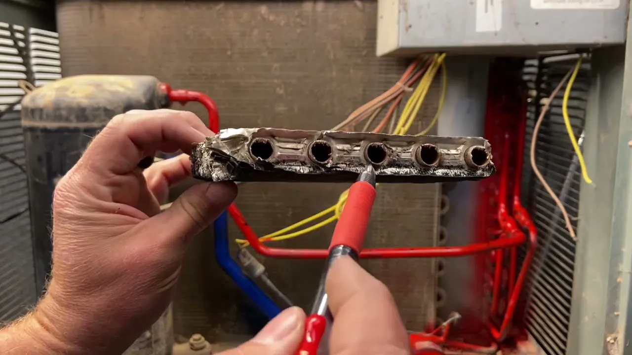 talked about this is what we call a tube and fin refrigerant runs through the tubes exchanges heat to the fence we also have what we call a micro channel which is similar to a radiator of a car where we have a large chamber that the refrigerant runs through and then it runs these little micro channels right here these little bitty bitty bitty holes all i'm running through and it exchanges the heat to the aluminum and then we're also we're still pulling air through this so we're exchanging the heat from the refrigerant through the metal to