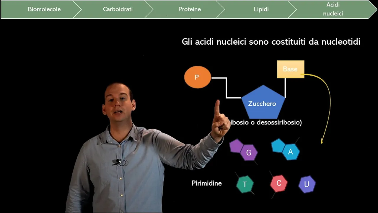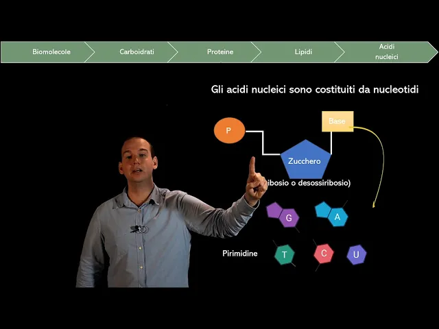 azotate ma tre solo corrispondono abbiamo le quattro base dotate del dna che sono a tgc mentre rna al posto della p.a la calura cile 5 base dotate sono le seguenti qua nina adenina timina citosina cura cile le prime quattro sono del dna e quelle invece è appunto delle arene a sono guanina adenina citosina e uracile non c'è ovviamente la timina a mio avviso c'è un modo particolarmente utile di ricordarle che è a tgc per un motivo molto semplice come vedrete dopo tendenzialmente as i can dei legami inter molecolari tra a e ti mentre viceversa e