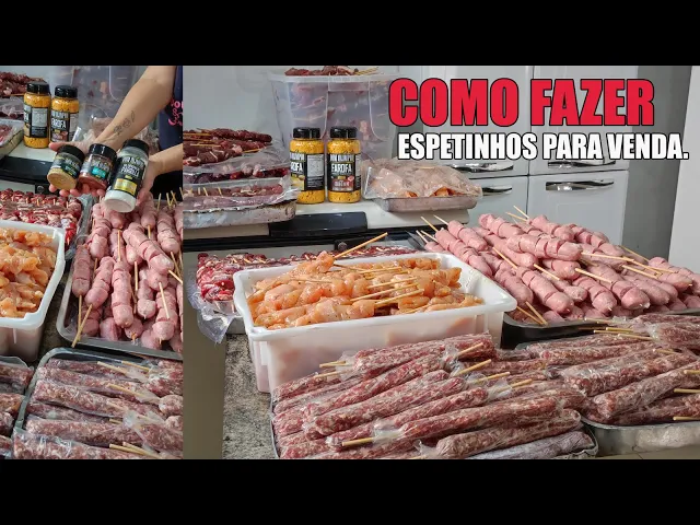 espíritos 15 pedaços de carne ele vai dar 100 gramas certinho tá e se tiver muito pequeno são seis pedaços de carne mas quando a carne está desse tamanho que está aqui cinco pedaços ela dá 100 gramas tranquilamente então aí você começa a montar procura não deixar. Aqui ó fora porque se você deixar pronto ela queima e fica e o seu espírito bom então é isso olha os espetinhos ficaram prontos consegui a que horas 120 está tudo prontinho aqui bonitinho lei já viram como que é que faz bonito né olha no espetinho mais lindo que o