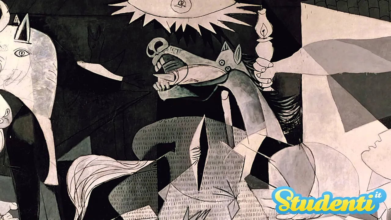 anche tu trovi incomprensibile l'arte contemporanea Beh non ti preoccupare perché ci pensa studenti.it da oggi a risolvere i tuoi problemi e oggi inizieremo ad analizzare un'opera molto molto celebre che è la Guernica di Picasso iniziamo col dire che L'opera è conservata all'interno del Museo Reina Sofia di Madrid e che colpisce moltissimo per il grande impatto visivo che scatena chiunque la guardi misura Infatti ben 3 m e mezzo in altezza e quasi 8 m di larghezza e sapete qual è la cosa più più sorpr ente che Picasso la dipinse in pochissimo tempo Difatti ci impiegò per