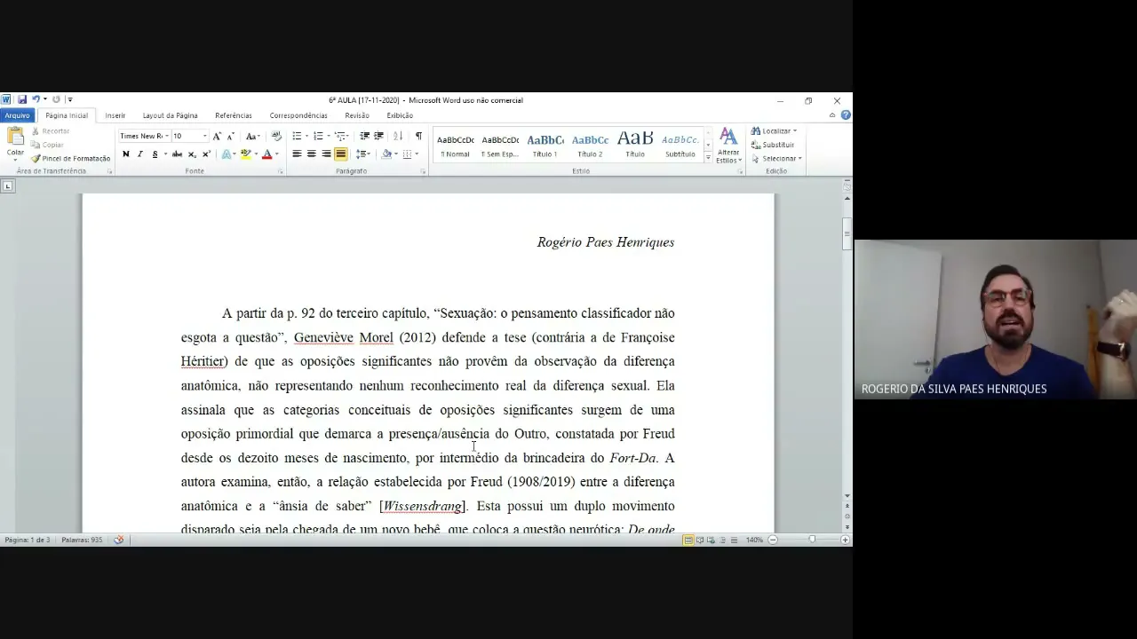 Oi bom dia então a todos estamos iniciando mais encontro da disciplina que o sempre esqueci o nome mas vocês sabem qual é a né seminário seminários avançados de pesquisa cinco da da pós-graduação em psicologia da UFF s.a. hoje é dia Dezessete de novembro e no Encontro de hoje eu fiquei de concluir o capítulo terceiro do livro da GNR Morel e partindo da página 92 que se conclui na página a 104 E então é são esses são essas páginas que eu eu pretendo comentar hoje a ficção páginas densas nela Faz uma leitura pensa cinco froid e