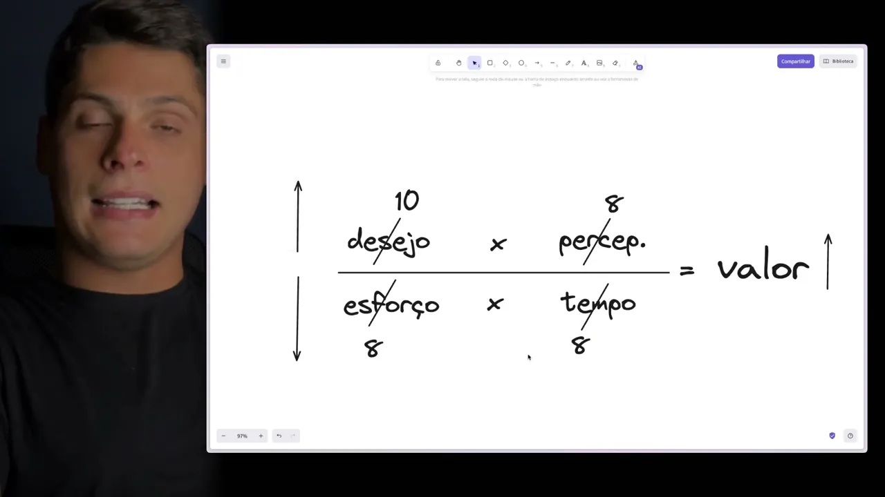 precisa imaginar uma pequena esteira imediata Então como que eu posso aumentar essa percepção ofertando produtos estratégicos para levar isso daqui talvez mais próximo de 10 aí eu tenho quase que a nota máxima ali que seria 100 né 100 dividido por 1 basicamente é a oferta perfeita 100 dividido por z0 então se eu reduzir o esforço basicamente é a fórmula do infinito que basicamente por exemplo quando a gente pensa no mercado de emagrecimento até o exemplo que o hermose dá basicamente é quando você faz uma cirurgia tempo esforço vai a zero percepção de resultado muito alto