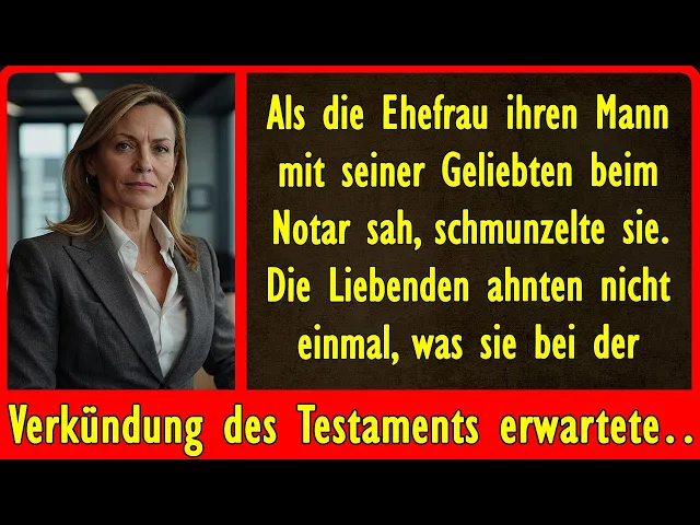 Hallo herzlich willkommen auf dem autorenkanal Weise Geschichten viel Spaß beim anschauen als die Frau ihren Ehemann mit seiner Geliebten beim Notar sah schmunzelte sie die Liebenden hatten keine Ahnung was sie erwartete als das Testament verlesen wurde re wann kommst du zurück sprach seine Frau wütend am Telefon ich bin nicht aus Eisen ich habe nicht die Kraft zu Arbeit und mich um Alanzo zu kümmern soll ich also alles fallen lassen und nach Hause kommen antwortete reev wütend weißt du danita ich bin auch nicht aus Eisen ich versuche diesen Job zu behalten weil wir unseren Sohn behandeln