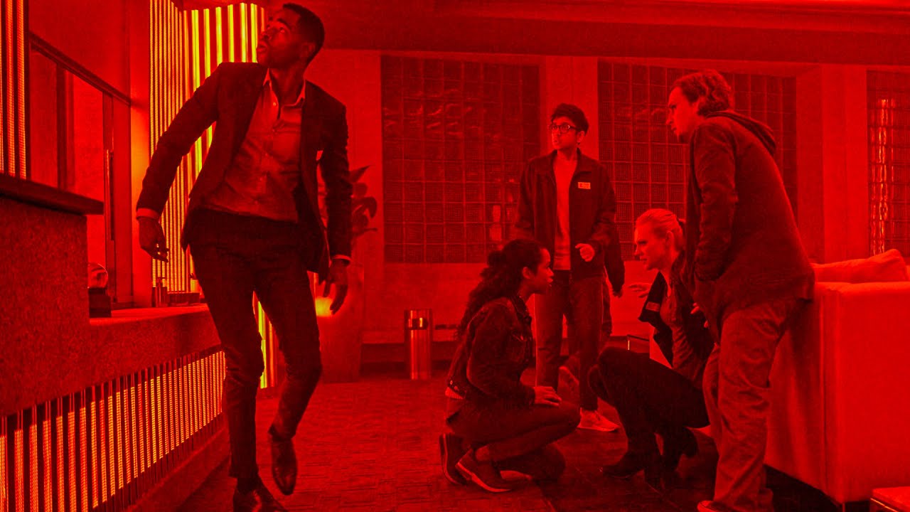 The beeping continues and the electrical charge starts building, it kills the first man before he can speak again. Everyone is panicking now, but as they are calming down the guy in the hat figures out that he's controlling the lights on the floor. The light stops in front of a woman and the electricity zaps her.