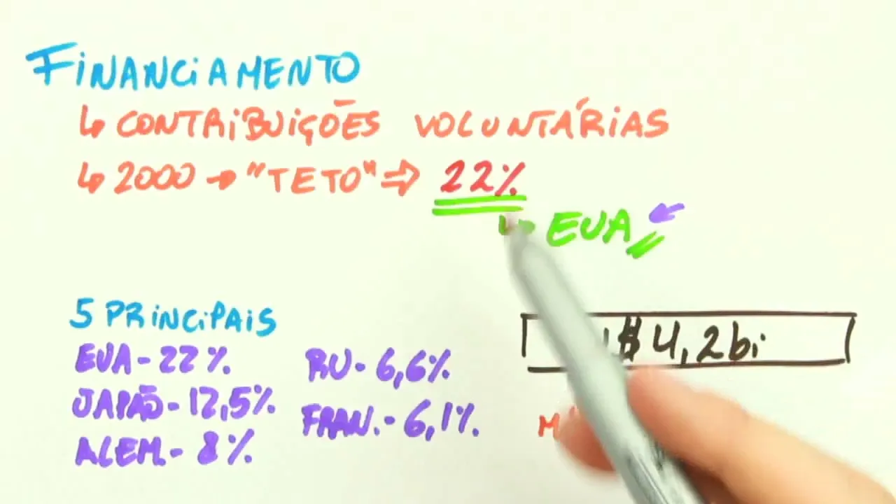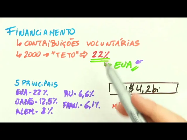 fazendo parte da ONU certo e esses estados membros vão dar contribuições voluntárias paraa instituição beleza bom Outra coisa importante desde 2000 tu tem um digamos assim teto de contribuição dentro do orçamento da ONU esse teto esse limite máximo corresponde a basicamente 22% do orçamento da ONU só E aí te liga só os Estados Unidos que são os principais ã contribuintes aí vão atingir esse teto os outros países Japão Alemanha Reino Unido França não conseguem atingir esse máximo Beleza então te liga Estados Unidos hoje já diminuiu a porcentagem de do orçamento das Nações Unidas fornecido pelos