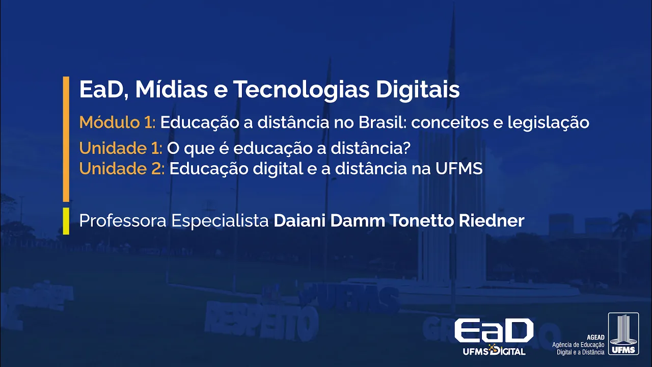 [Música] Olá eu sou a professora Daiane ridener e essa é a disciplina EAD Mídias e tecnologias digitais nessa vídeo aula eu vou te apresentar o módulo 1 educação à distância no Brasil conceitos e legislação que está organizado em duas unidades na unidade 1 a gente vai aprender um pouquinho sobre o que é educação a distância e você vai ter acesso a materiais que vão te ajudar a entender um pouquinho dessa modalidade sobre os principais conceitos e você vai saber que ela é uma modalidade de ensino mediada pelo uso de tecnologias digitais de forma sistemática e