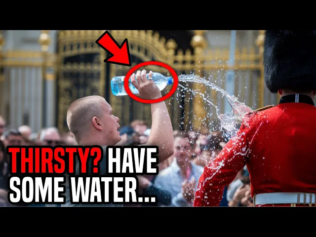 of the spotlight he unscrewed the cap with deliberate slowness each turn of the plastic accompanied by the quiet clicking sound that seemed unnaturally loud in the tense atmosphere then taking a deliberate step closer to the guard he held the bottle high above his head his intention unmistakable let's see if he's really unshakeable Dave announced his voice carrying a note of Triumph as he tilted the bottle the water caught the sunlight as it fell creating a brief rainbow before splashing down onto the guard's pristine red tunic darkening the wool and running in rivulets down the carefully