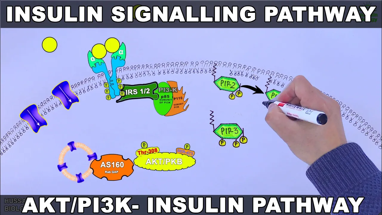 shown in the diagram and we also have pip2 molecule bound to the cell membrane as shown in the diagram now to start a pathway we have insulin molecules present outside of the cell the insulin molecules comes in and binds on the alpha subunit of receptor as shown in the animation this ligand binding or the insulin binding drives the dimerization of insulin receptor as shown in the diagram and from this dimerization we get the intracellular cross phosphorylation of tyrosine domains on beta subunit of receptor now from here the downstream molecules are recruited and activated first of