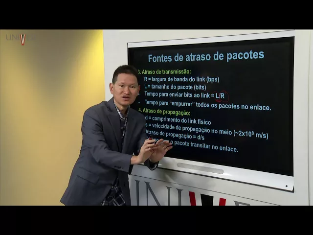 transmissão esse atraso na transmissão seria o tempo o tempo pra atenção da pessoa o tempo pra empurrar pra colocar todo o pacote no link de transmissão isso seria o que isso seria o atraso na transmissão então o tempo pra eu colocar o repetir que o tempo para colocar o pacote inteiro no enlace de transmissão seria o que seria o que ele chama de atroz no transmissão por isso ele vai depender do que por isso ele vai depender aqui do tamanho do tapa do do pacote né e vai depender também do do do rating seria da
