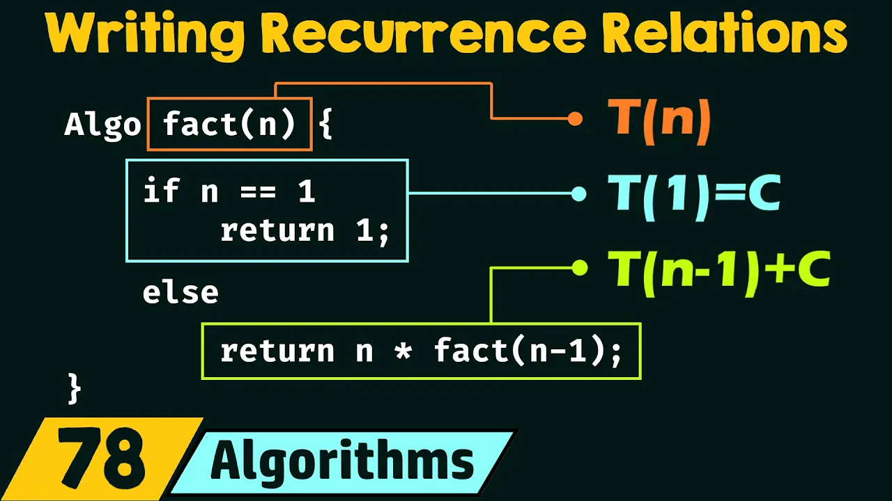 [Music] finding the time complexity of recursive algorithms is not as straightforward as finding the space complexity of recursive algorithms which we have already understood in our previous chapter we are starting with this new chapter where we will learn how to write recurence relations for recursive algorithms and then ultimately solve and analyze our recursive algorithms in order to find time complexity and sometimes in order to find the return value and the number of operations of recursive algorithms we will learn all of these Concepts in this chapter so our focus of this chapter will be to analyze
