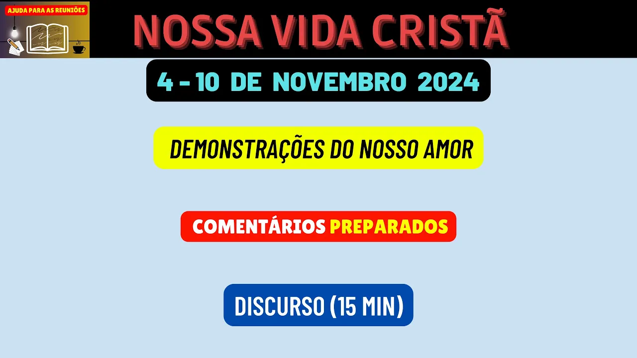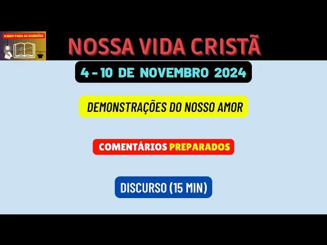 sejam bem-vindos novamente queridos irmãos ao nosso canal ajuda para as reuniões meus amados na sessão nossa vida cristã desta semana 4 a 10 de novembro nós teremos um discurso muito importante de 15 minutos Onde teremos três perguntas com base num vídeo para respondermos e neste vídeo vamos analisar e preparar as respostas dessas perguntas para que os irmãos consigam também comentar Nesta parte [Música] então o tema do discurso é demonstrações do nosso amor vamos fazer a leitura aqui do primeiro parágrafo quando Usamos nosso tempo energia e recursos financeiros Para apoiar as atividades do reino demonstramos nosso