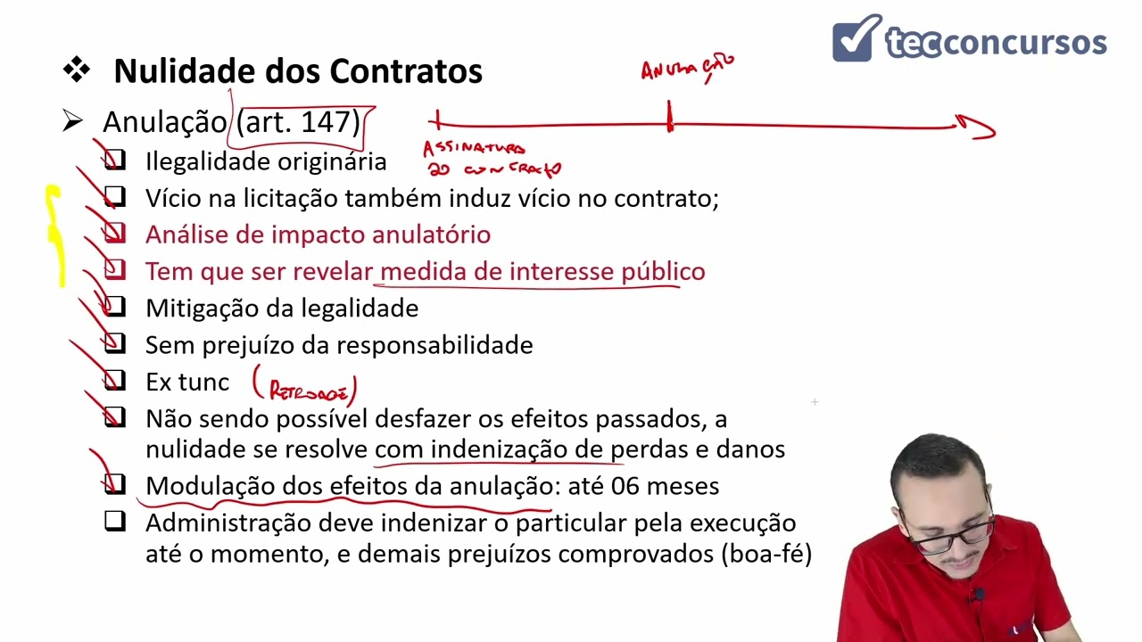 E aí [Aplausos] [Música] bom para você meu amigo minha amiga aqui do tec concursos tudo bem eu sou professor Bruno linda seu professor de direito administrativo eu tô aqui para gente conversar um pouco vai continuar o curso de licitações e contratos dentro Nossa Querida disciplina de Direito Administrativo vamos comigo vamos aqui continuar a estudar licitações contratos estamos uma parte de contratos administrativos exatamente agora nós vamos estudar as hipóteses de extinção dos contratos administrativos é o item 14. 04. 18 gente sobre as hipóteses de extinção do contrato nós temos 3 grandes hipóteses né três grandes possibilidades de contrato administrativo seu instinto a doutrina diz essa divisão de visão doutrinária essas três grandes grupos três possibilidades três hipóteses de extinção e primeira a primeira hipótese de extinção do contrato é pela extensão natural né gente primeira hipótese é a extinção a extensão natural o professor O que é a extensão natural a extensão natural gente é aquela extinção do contrato administrativo que se espera quando a gente assina o contrato administrativo a gente espera que ele seja extinto por esse motivo é a conclusão do objeto ou Advento do termo conclusão do objeto é uma obra por exemplo é um contrato para obra finalizou a obra finaliza o objeto contratual contrato ele vai ser sinto a finalidade do contrato ela foi comprida gente não era a finalidade do contrato na construção de uma obra era a construção da obra não foi feita foi o contrato vai continuar para que a professora mas esse contrato ele ainda tem tempo eram a obra deverá ser feito aí tem um prazo contratual aí de oito meses e essa obra foi finalizada em seis beleza acaba obra tudo certinho acaba tudo tem pendência nenhuma e tive um contrato não precisa esperar o tempo acabar porque se trata de obra Beleza agora existem contratos que ele vai ser tempos vão ser stents pelo Advento do o que não tem um objeto a ser concluído por exemplo prestação de serviços aí eu vou contratar a prestação de serviço para o órgão é um serviço de limpeza por exemplo é um serviço de limpeza e serviço de limpeza eu contrato pelo por um prazo por exemplo de dois anos hora seu contrato por dois anos e se comprar só vai acabar após os dois anos após um ano após o homem mais prorrogações enfim mas o quando acaba o tempo do contrato e suas eventuais prorrogações acabou esse período o contrato extinto a extinção outro lado eles vão vai acabar antes do prazo determinado não ele acaba no prazo determinado em contrato em seus aditivos primeira forma de extinção do contrato é a extensão natural é a conclusão do objeto o advento o advento do tempo beleza show de bola ok pessoal temos também a anulação do contrato administrativo ele pode ser anulado essas hipóteses de anulação nós vamos trabalhar lá na frente no próximo tópico tá porque ele tá previsto aqui no artigo 147 anulação de um contrato o tempo gente ela depois de um vício originário vamos falar sobre isso já já mas eu quis apenas citar para você aqui para você entender que também uma forma de extinção do contrato e nós temos e as hipóteses de rescisão contratual do ato administrativo aqui o contrato ele vai ser recebido aqui nós vamos conversar a previsão para essa rescisão contratual ela tá mais trigo 138 da nossa 14.