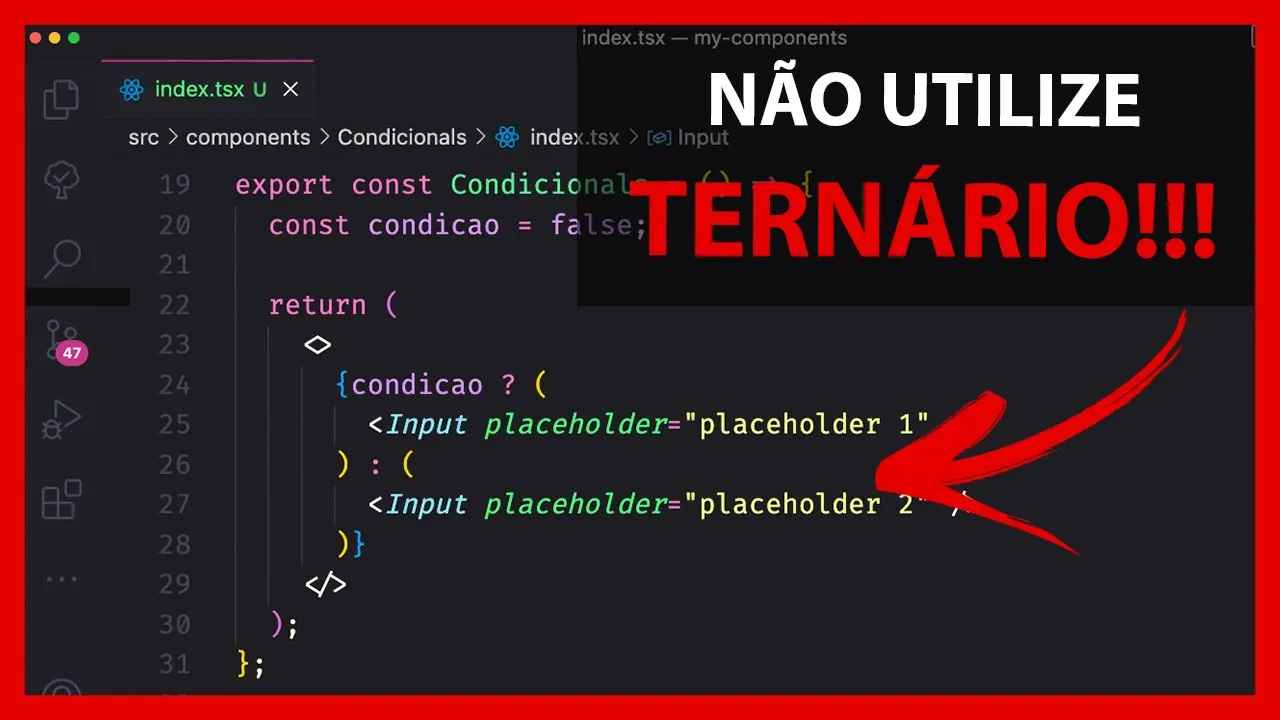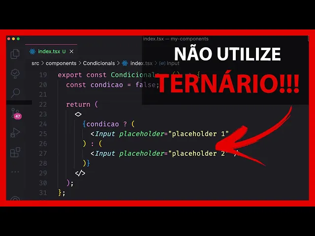 a segunda observação é quando a gente for utilizar alternario deixar claro a condição né a condição do terrário que ela que é importante né então eu vou ter a condição aqui e aí tal coisa e se não outra coisa então Deixar claro o mais simples possível essa condição aqui né porque ela é a partir dela que eu vou gerar renderizar algo ou então outro um componente até um outro né então deixar claro isso essa condição aí e o terceiro né terceira observação aqui bastante importante vai ficar mais importante de todos é que importas e nenhuma