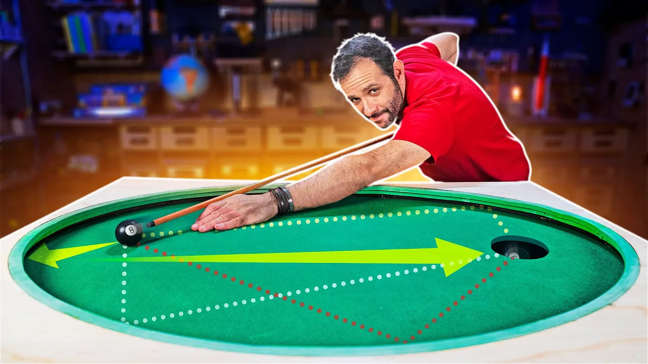 cima de um ponto focal e colocar um ponto de partida em cima do outro ponto focal eu posso bater na bolinha do jeito que eu quiser que ela vai até a parede e vai ser encaçapar eu posso bater em qualquer sentido de qualquer jeito a bolinha sempre vai parar na caçapa na teoria né vamos ver se funciona na prática essa aqui é uma folha de compensado de 6 mm de espessura que a gente usa muito no Laser aqui no manual do mundo essas coisas que estão aqui no fundo foram todas construídas com esse compensado Tá