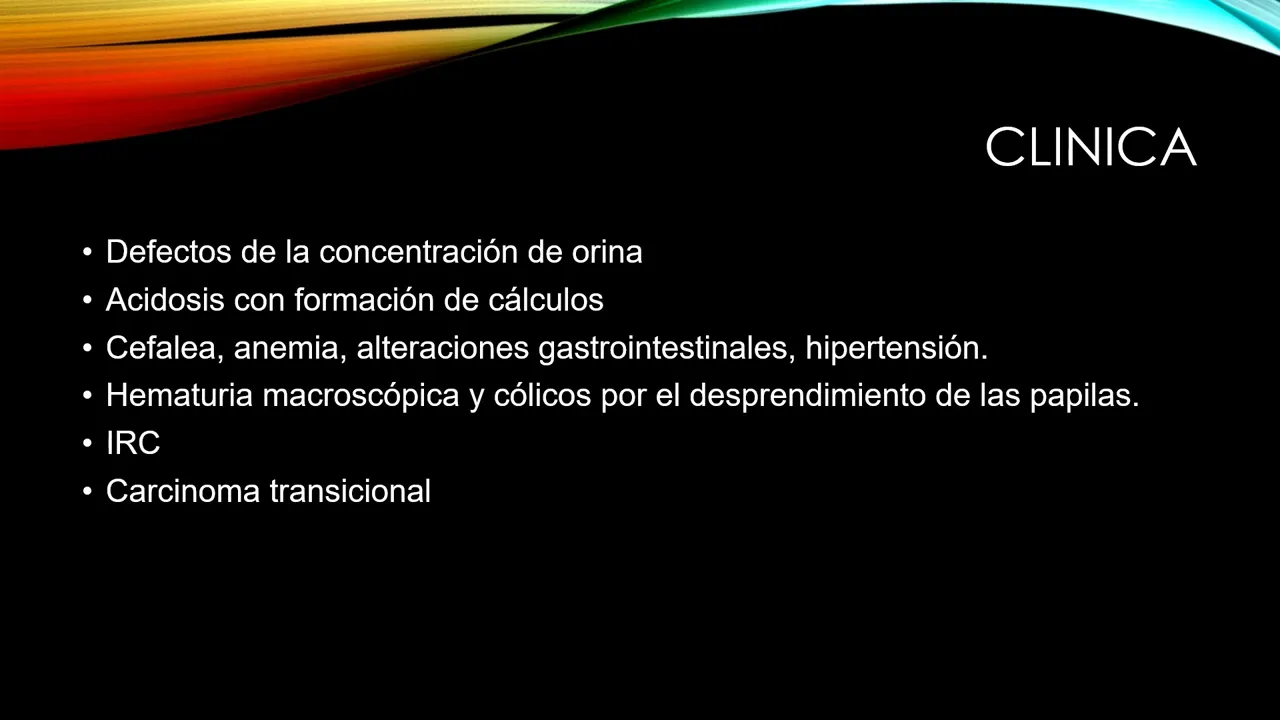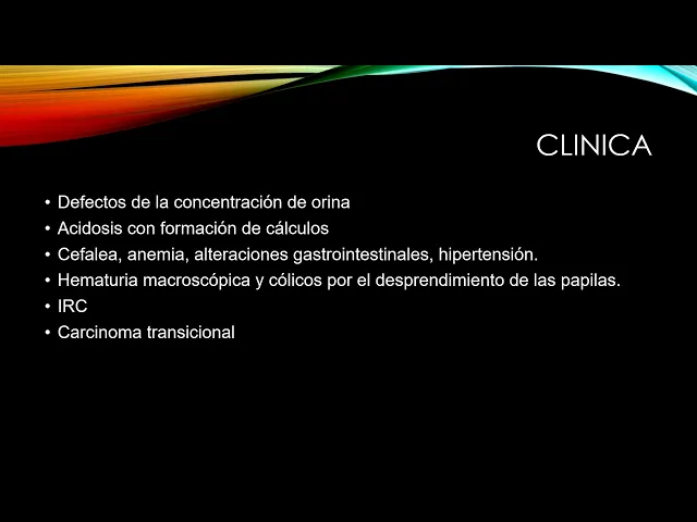 nefritis túbulo intersticial crónica asociada en necrosis papilar o bien una insuficiencia renal crónica que se puede encontrar defectos en la concentración de orina acidosis conformación de cálculos cefalea anemia alteraciones gastrointestinales hipertensión necrosis tubular aguda con desprendimiento de esas papilas que se manifiestan con cólicos renales y hematuria macri microscópica insuficiencia renal crónica y predisposición al carcinoma transicional la nefropatía por hierbas chinas es muy rara y se manifiesta por una necrosis tubular intersticial crónica asociada al consumo de ácido aristolóquico de hierbas medicinales se va a observar una fibrosis con infiltrado leucocitario y predisposición al carcinoma renal y