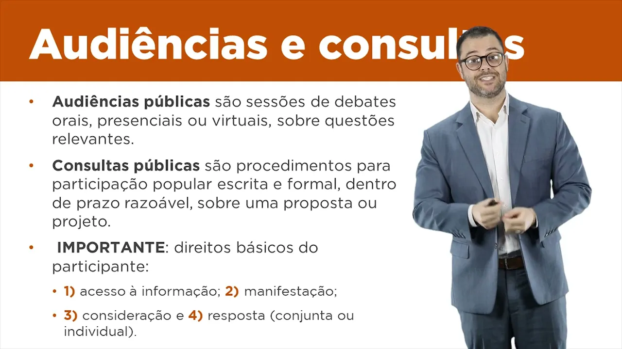desenvolvimento urbano então a grande diferença está no fato de que a audiência é uma sessão de debate oral e a consulta público é um procedimento mais longo no qual o poder público oferece uma determinada proposta paraa população analisar e a população responde a essa proposta com sugestões com críticas escritas tá bom muito importante pessoal nós não temos claramente no estatuto nem mesmo na legislação de Direito Administrativo uma sistematização são dos direitos dos participantes então vejam que é muito importante que nós criemos aqui uma cultura de respeito a direitos mínimos e na minha análise existem quatro