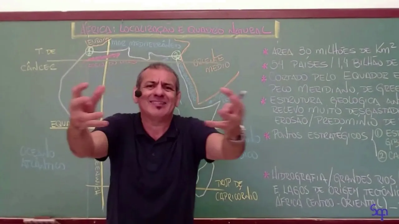 e fala aí galerinha Professor Aroldo Bueno professor de geografia para mais uma aula sem estacionar hoje nós vamos falar olha aqui ó do continente africano África localização geográfica e um pouco do quadro natural deste maravilhoso continentes sensacional e [Música] E aí E aí Bom vamos lá olha aqui o continente Africano o pessoal ele está localizado entre a Europa ao norte e a Ásia ao leste E aí nós vamos ter os oceanos Atlântico na parte ocidental do continente africano portanto a oeste e o Oceano Índico a leste limitado também ao norte pelo Mar Mediterrâneo e aqui