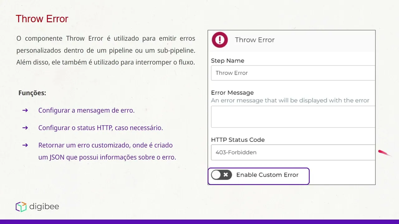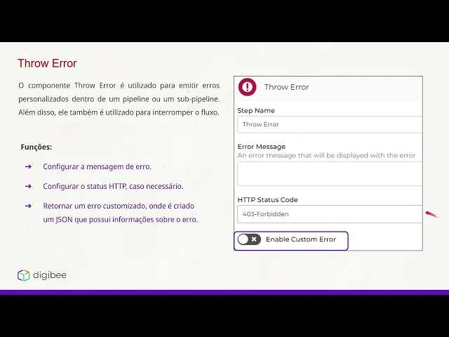 Olá esse é o integration da Bela pergunte fazendo uma revisão do curso nesse vídeo falaremos sobre o componente true O componente é utilizado para emitir erros personalizados dentro de um pipeline ou sobrepline E além disso ele também é utilizado para interromper o fluxo quando for necessário algumas de suas funções são configurar mensagens de erro configurar o status http caso necessário e retornar um erro customizado onde é criado um Jason que possui informações sobre esse erro a direita temos os parâmetros de configuração desse componente o step name é o nome do componente que aparecerá diretamente no