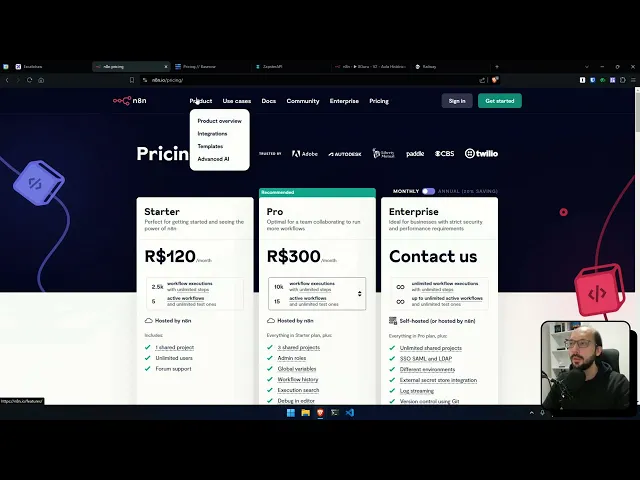 né a API da OpenAI você podia é fazer pós-pagos colocava teu cartão lá usava e depois pagava Mas hoje você precisa colocar lá no mínimo 5 dólares pra começar, tá? Eu sei que o dólar tá meio pesadinho hoje em dia no Brasil, mas eu garanto pra você que é mais do que o suficiente pra você fazer essa aula aqui e ainda talvez entrar na comunidade e fazer as aulas da comunidade, tá? Então não se preocupe, beleza? Dito isso, vamos começar nos cadastrando nessas ferramentas aqui. Então, vamos começar pela principal, que é o próprio n8n. Então,