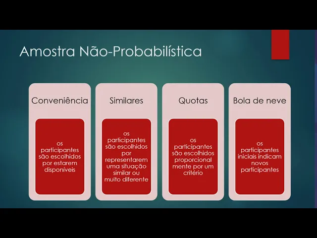 cotas e a bola de neve quando você coloca amostra não probabilística você tem que dizer o quê quais são os participantes que foram escolhidos por estarem disponíveis né pode ser que você não tem acesso a lista de todos os alunos do ismd por exemplo mas você tem uma lista aqueles que estão disponíveis então você pega o que tá disponível e faz ela não probabilística e quando você faz pelo similares os participantes eles são escolhidos por representarem uma situação similar ou mais uma situação muito diferente então todos os alunos são muito estudiosos tão é uma situação