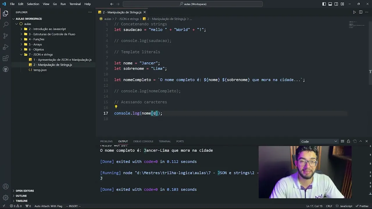 eu acredito que não e eu quero recapitular aqui porque as Strings elas elas são uma estrutura indexada também né parecido com o Array então eu consigo eu vou comentar aqui esse console log e esse outro aqui eh eu consigo na string fazer o seguinte acessando caracteres eu consigo fazer o seguinte ó console log na no nome completo eu consigo pegar no índice que eu quero né então aqui ó no índice zero de nome né nome pode ser nome esse console log vai retornar o caracteres J né então nome e e Strings também são indexadas o