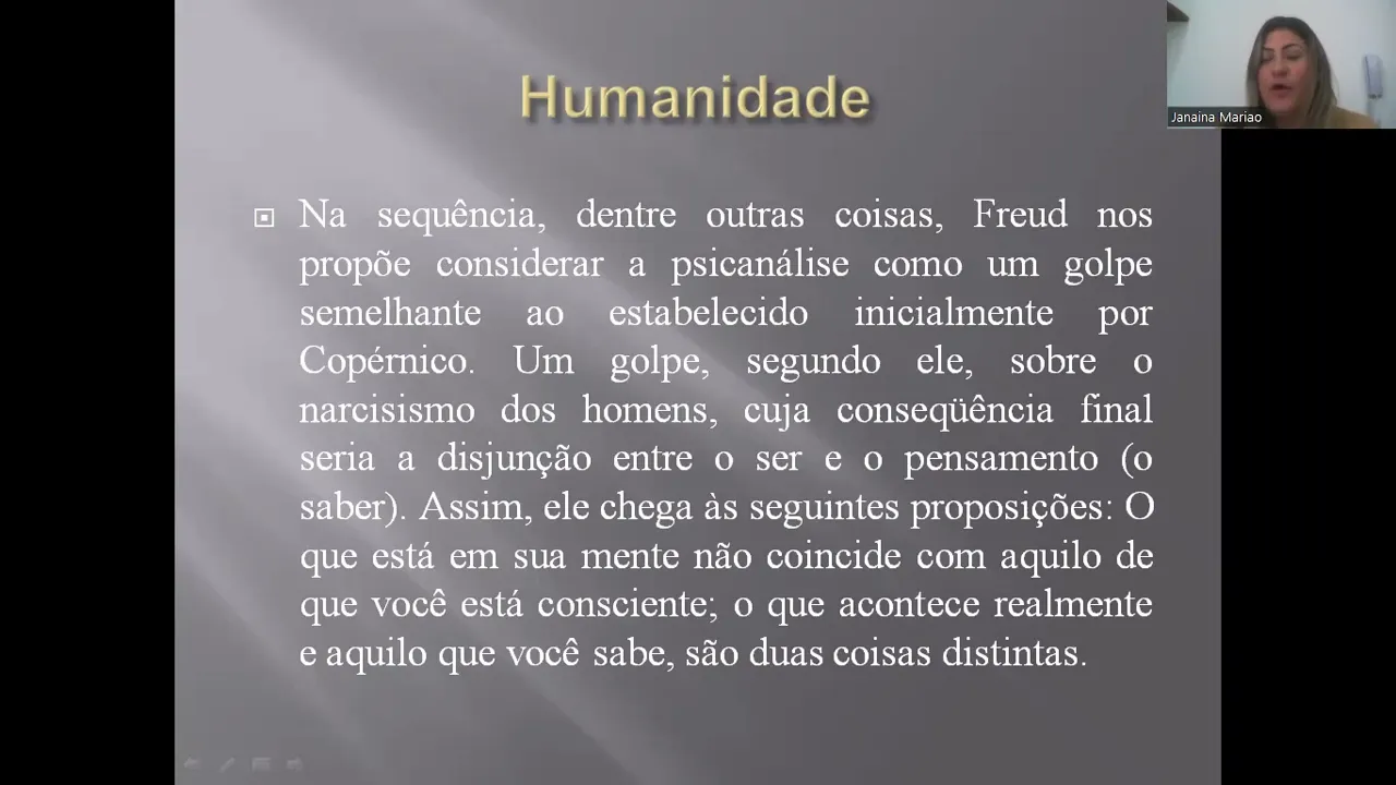 pensamento ou seja o saber entre o que eu sei o que eu acredito que eu sei e o que realmente é assim ele chega a Seguinte proposições o que está em sua mente não coincide com aquilo que você está consciente o que acontece realmente é aquilo que você sabe né ou seja o que você conhece e o que tá acontecendo e o que você sabe são coisas totalmente distintas então Freud ele vai falar para nós sobre o olhar de compreensão sobre o desenvolvimento da Humanidade para que através dessa compreensão nós possamos entender o quanto somos