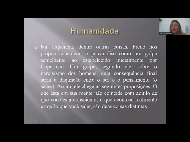 instruções ele vai ajudar em outras coisas ele vai prover material ele vai garantir que a criança vai para escola todos os dias mas ele sozinho não vai conseguir ajudar no auxílio da alfabetização da criança uma vez que ele não foi Alfa e assim por diante então a humanidade Vale aí toda essa pincelada que eu fiz para vocês agora um pouquinho sobre a humanidade que é justamente para A gente refletir um pouco do quanto ainda nós estamos engatinhando dentro da psicanálise e dentro do consultório dentro da Clínica psicanalítica vocês vão encontrar pessoas e enraizadas aonde ela