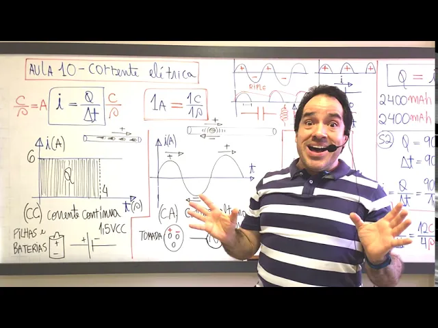 segundo né e colorido por segundo é aquele famoso ampere né uma pele é a mesma coisa que 1 coulomb por segundo 3 amperes três colups por segundo então se eu tiver uma corrente de 10 amperes 10 coulomb por segundo e assim por diante né pô galera no dia a dia existem várias formas de correntes mas as mais comuns são a corrente contínua e a corrente alternada renato brito corrente contínua é o quê cara a palavra continuar que quer dizer constante corrente elétrica continua é uma corrente elétrica constante que nem aqui ó vocês amperes 6 amperes