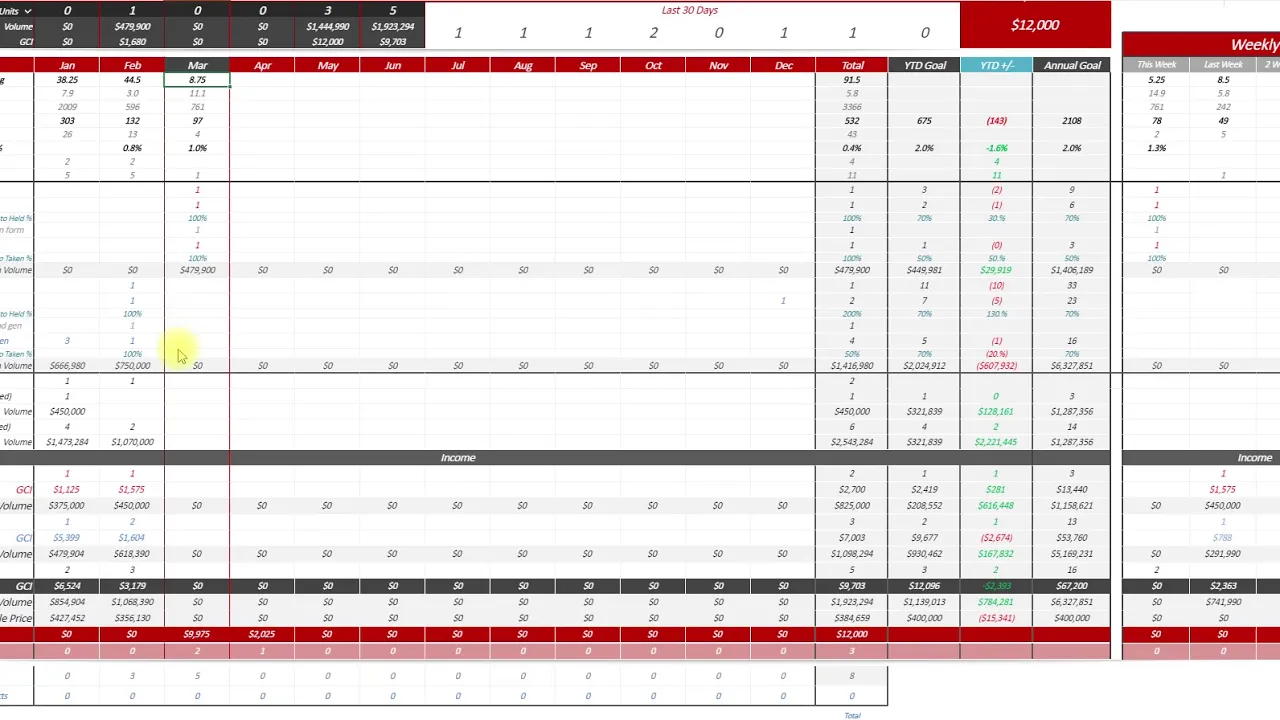 for one-on-one tea and it always highlights the current month that we're in so you can see marches highlighted here because that's the month we're in we can see how many hours they spent lead generating if you're tracking that contacts per hour they're dials contacts and then we get down to appointment set and held which are obviously a little bit more important to be able to see if we're getting any results and then we're able to see all their close transactions down at the bottom and every agent has their own whiteboard down here as well so