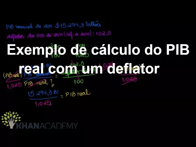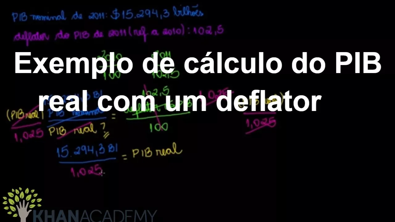 digamos que o pib nominal de 2011 nos estados unidos tenha sido de 15. 200 94,3 bilhões de dólares ou a gente pode ser também 15,2 1943 trilhões de dólares na verdade eu não estou simplesmente inventando esse número não essa é realmente a estimativa de quanto foi o pib no quarto trimestre de 2011 quando dizer também que o deflator do pib de 2011 que é relativo ao ano de 2010 e a gente tem que sempre saberá qual ano o deflator relativo né esse fator é 102,5 uma das maneiras de interpretar isso é o seguinte se o ano base é 2010 isso significa que os preços em 2010 podem ser vistos como 100 e agora em 2011 eles são 102,5 um outro jeito de pensar também a gente já viu isso é que o nível geral dos preços subiu em 2,5 por cento de 100 para 102,5 bem então agora que a gente sabe o pib nominal de 2011 o valor do deflator a gente pode descobrir qual é o pib real de 2011 e esse bebê ao ver esse relativo ao preço de 2010 já que nós deflator é relativa a esse ano certo então pra fazer isso a gente só precisa lembrar que a razão entre o pib nominal e o pib real vai ser igual a razão entre os preços atuais e os preços de 2010 ou outro jeito de pensar também que vai ser a razão entre o nosso deflator que a 102,5 e 100 então nosso pib nominal é 15. 290 e 4,3 bilhões o pib real é o que a gente quer descobrir a gente ainda não sabe quanto é que o deflator do pib é 102,5 ea gente pode resolver isso para descobrir o pib real 102,5 / sem a gente pode fazer isso aqui de cabeça vai dar 1,0 25 e aí a gente pode dividir os dois lados da equação 10 25 e multiplicar os dois pelo pib real e aí esses dois aqui vão cancelar esses vôos também eo pib real mas é igual a 15 mil duzentos e noventa e 4,3 bilhões / 1,0 25 se eu fosse definir os conceitos macroeconômicos eu colocaria aqui um e aqui já ficaria 1,0 25 porque aí não precisaria ficar dividindo x 100 pra mim isso faz muito mais sentido mas de qualquer modo a gente vai acabar chegando ao mesmo valor então a gente tem aqui que o pib real é o nosso pib dos preços atuais que é o pib nominal dividido pelo que bem eu preferiria chamado de fator mas enfim dividido pelo deflator devido por cento aí a gente está fazendo a deflação do pib nominal para chegar no pib real vou pegar a calculadora que para fazer essa conta 15.