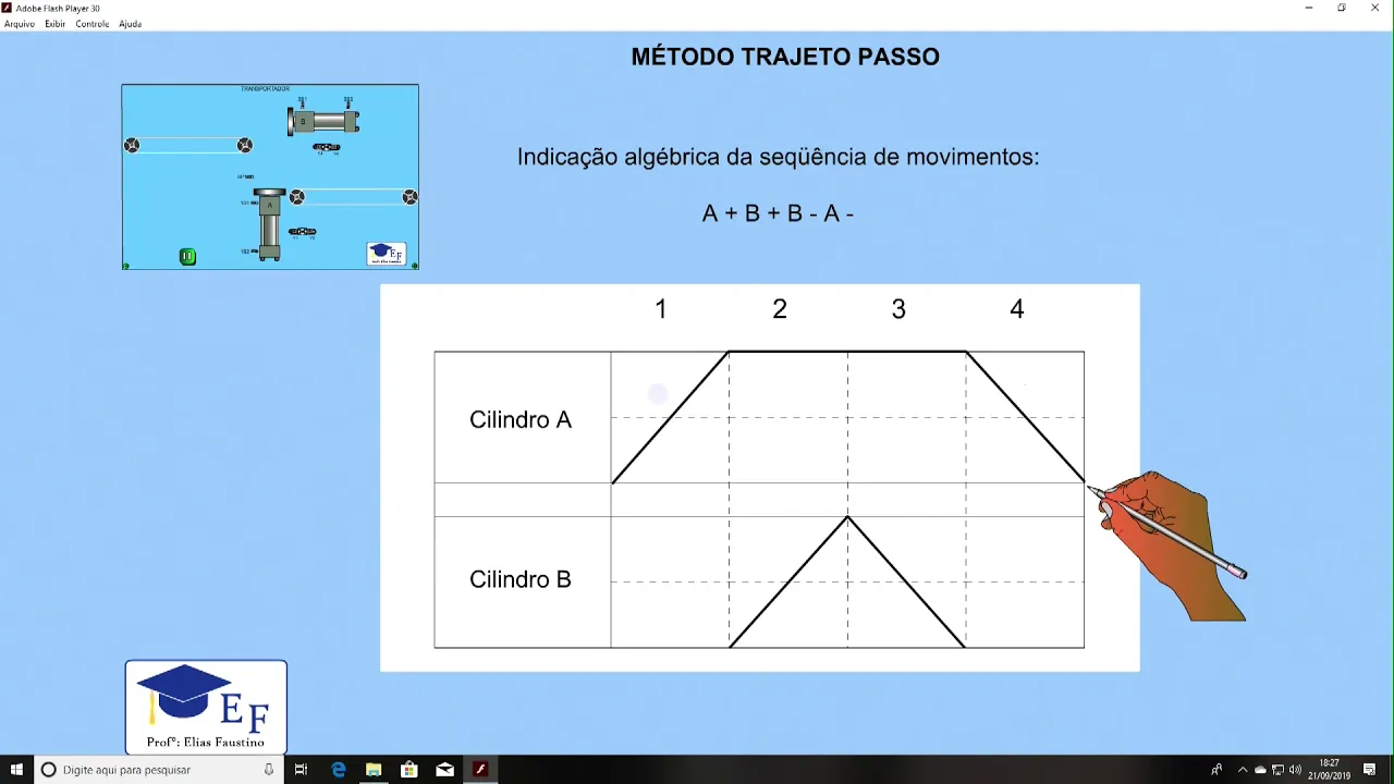 olá pessoal professor elias neste vídeo vou falar sobre o método trajeto passo vou usar como exemplo o transportador já utilizamos em outros nem outros vídeos aqui ó são dois cilindros cujo movimento é a mais de mais - a menos o primeiro passo é fazer a indicação algébrica na seqüência de movimentos como eu havia falado a + b + b - a menos a próxima etapa é definir quantos movimentos terão e indicar no gráfico quais são os movimentos como o primeiro olá aqui é o início do movimento aqui o final temos o avançando quando avança ele