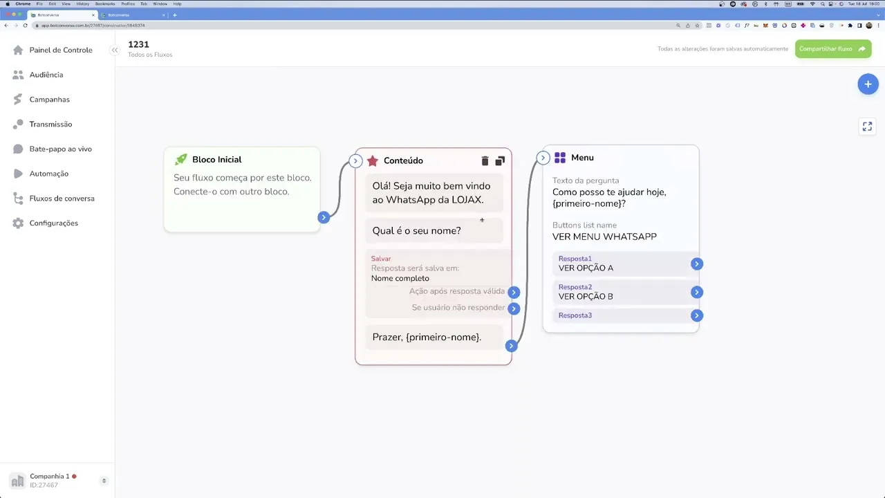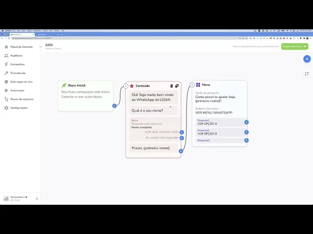 Olá tudo bem Seja bem vindo esse vídeo nesse vídeo eu vou te mostrar como é que você utiliza um menu com botões dentro do seu fluxo aí do bot conversa bem muito simples dá uma olhada nesse fluxo aqui ó imagina que esse fluxo aqui é um fluxo que você vai utilizar para dar boas-vindas a alguma pessoa então você pode falar Olá seja muito bem-vindo ao WhatsApp da loja x Qual é o seu nome a pessoa vai dar o nome dela você salva o nome dela no campo aqui no nosso caso o nome completo e depois