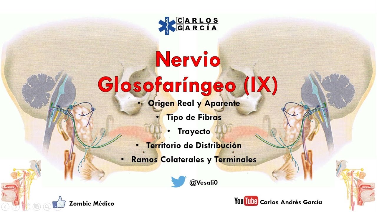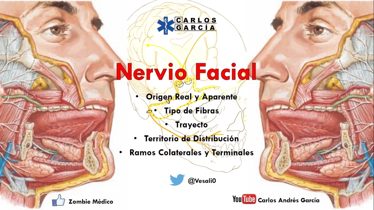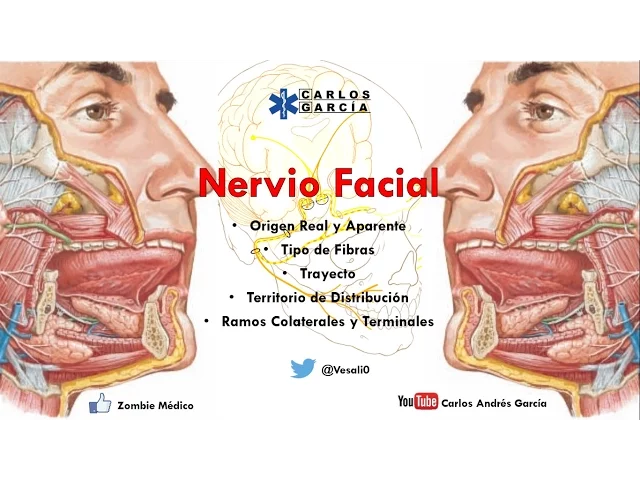 muy bien ehe de hoy vamos a hablar sobre el nervio facial Sí vamos a hablar de su origen real su origen aparente el tipo de fibras que posee su trayecto territorio de distribución Ramos colaterales y Ramos terminales no se olviden seguirnos en nuestras redes estamos en Facebook como zombie médico eh voy a poner las diapositivas en la descripción y si quieren también me pueden seguir en mi página personal estoy como Carlos Andrés García y no se olviden de suscribirse sin más que decir empecemos con la clase Entonces tenemos que el nervio facial es un nervio