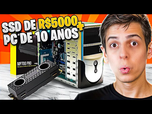 000 no PC de R 329 aí é sacanagem bom beleza que que a gente vai fazer agora vamos fazer alguns parâmetros vamos rodar alguns testes vamos primeiro inicializar o Windows Vamos abrir um software profissional vamos rodar um benchmark para ver qual que é o desempenho que vai ter num SSD Sata tradicional Esse é um SSD Sata então ele é aquele SSD mais utilizado quando você tinha um computador como esse aqui Provavelmente você utilizou HD se você tinha um PC desse daqui nem SSD você tinha mas se a gente comparar com HD vai ser ser muito triste tá ligado já vai ser chato só des instalar o sistema que vai est lento PR Caramba então a gente tá usando SSD Sata e vamos comparar para ver se a gente vai ter ganhos ou não colocando um SSD muito mais caro do que o nosso hardware nativamente comportaria porque aquele SSD de 5000 nem encaixa aqui a gente vai ter que fazer uma gambiarras vamos ver o que a gente consegue por aqui e a placa de vídeo tá acelerando a ventuinha sozinha do nada eu não sei por vamos instalar tudo aqui os drivers vamos deixar tudo bonitinho e vamos rodar esses testes Aguenta aí olha aí doidona mano Este vídeo é patrocinado por bitrix24. com. br um espaço de trabalho online gratuito que combina um poderoso sistema de CRM com recursos profissionais de gestão de tarefas e projetos para sua equipe use o link na descrição do vídeo para criar sua conta gratuita agora e ganhe 5 GB de armazenamento com usuários [Música] ilimitados agora que a gente já tem a base desse PC antigo Como ele trabalha e os resultados vamos colocar o SSD de R 5000 nessa belezinha e ver o que acontece bom esse daqui é o nosso mp700 pro ele é um SSD que tem até ventoinha ele tem um cabo aqui para ligar ventuinha bizarro mas a gente já testou esse carinha no canal a gente já sabe do que ele é capaz e se você quiser ver em detalhes o review disso daqui tá aí na descrição Esse mp700 pro ele tem teórico ele consegue Teoricamente de leitura toda vez que ele vai ler um arquivo instalado nele até 12400 MB por segundo de velocidade e de escrita quando ele vai escrever copiar a alg um arquivo Nele até 11.