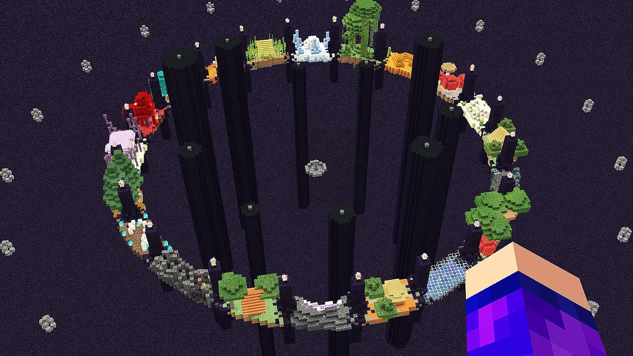 eu vou resolver isso aqui facinho e agora é construir a divisória daqui dos biomas né Se não ficar muito feio engraçado cara não tem nenhum Enderman aqui porque o nerfei tudo mas é só eu tirar essa tocha daqui que em alguns segundos começa a encher de Enderman ali velho e agora para a próxima Ilha eu vou fazer um bioma de spikes de gelo para isso eu só vou precisar colocar alguns gelos aqui mano e também tem os Sparks de gelo lógico e aqui no meio Eu posso até tentar fazer um mini gloob só que eu