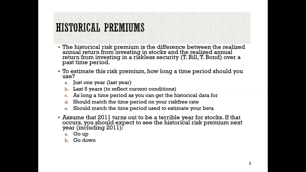 discussion we're going to start with the prevailing status quo look at the past and I'm going to tell you everything that makes me uncomfortable with using that and I'll also make a confession Before 2008 I used to let people get away using historical risk premiums post 20 8 I think you even lost the Fig Leaf we say what happened in 2008 to change that that that shift away but today we're going to talk about risk FR so before we do that though I want to kind of finish off the risk free rate discussions inspection so