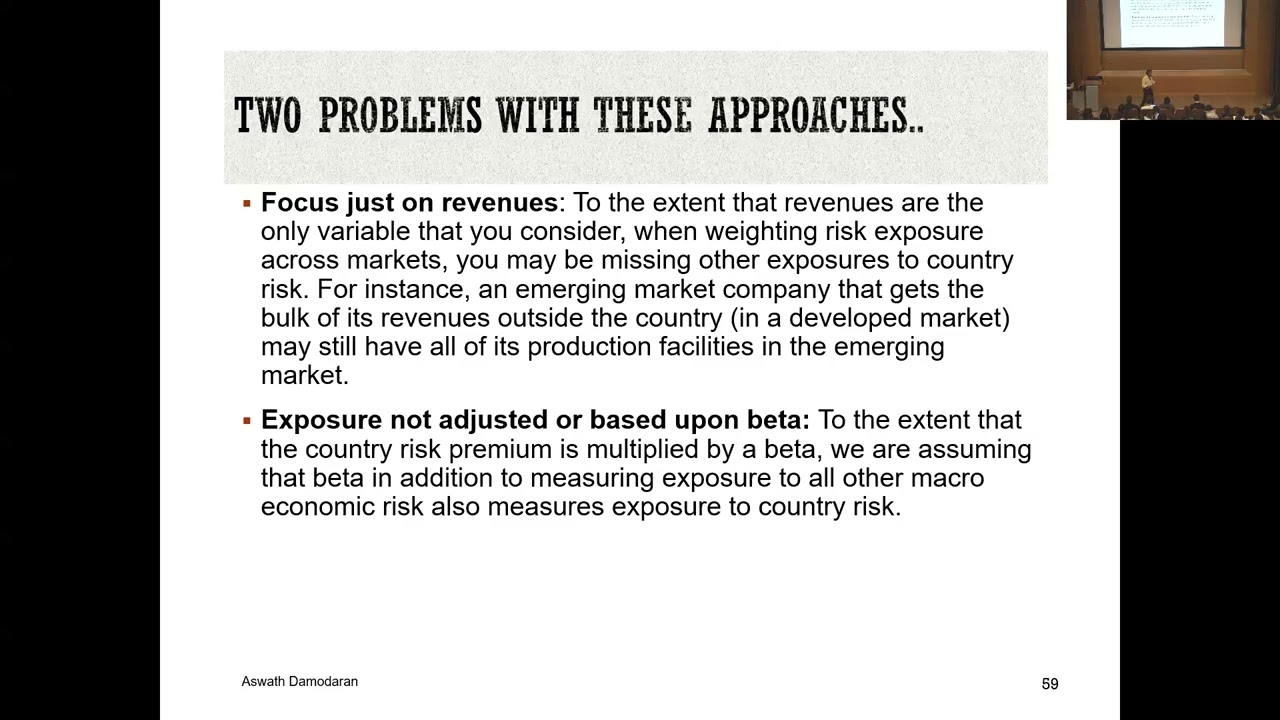 weighted approach of where you operate bring that into your Equity risk pre the second is you might say I don't care about revenues it's where I operate that I worry about risk I'll tell you the kinds of companies where I don't look at revenues I look at where you Operate and that becomes but in each of the these case what are you doing you're taking the countries where you either sell or make and use them to come up with a weighted average so you can be a company in a safe country that's incredibly risky you