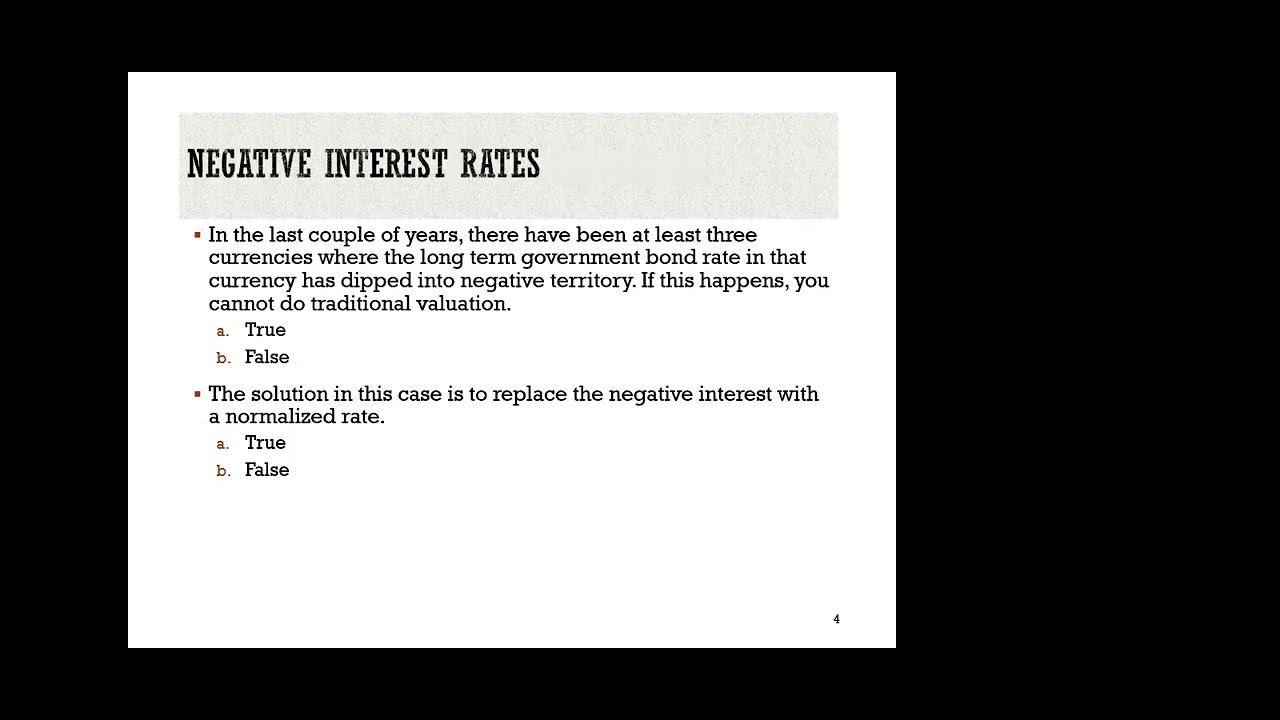 negative the question is should you continue to use them because remember you start with the risk free rate and build up to it you start with a negative number going to come up with a low cost of equity and low cost of capital so that was the fundamental question I was asked from European analyst is hey Euro risk free Rates look negative should I make it positive you know how some of them made them made it positive they took the minus and they drew a line through it say it looks plus it's a it's magical