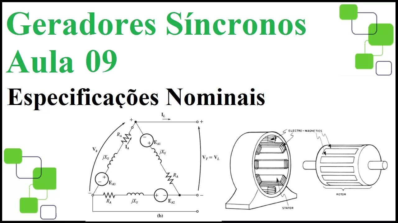 bom então hoje a gente vai ver a parte aí das especificações nominais tá desses geradores síncronos e aqui nesse primeiro slide aqui eu tenho o as principais especificações ali que tu vai ter na hora de de definir ali né o teu gerador síncrono para tua aplicação basicamente essas especificações elas vão estabelecer os limites operacionais da máquina né de modo a proteger essa máquina aí contra quaisquer quaisquer danos ali né PR gente não não exceder esses limites operacion mais ali para a máquina operar Nas condições corretas né então a gente tem aqui a a gente pode