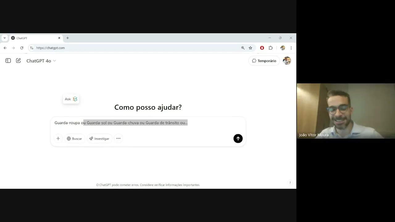 gente tem que saber mais do que ela para que a gente consiga avaliar quando alguma coisa tá falsa, como Geovan fez, né, e conseguiu evitar um problemão, tá certo? Professor, no caso de usar a IA para ler processo e resumir, ele pode errar? Se sim, como? Ótima pergunta, Tina! Muito obrigado pela tua pergunta, e a gente vai aproveitar ela para entrar... Num próximo conceito que eu quero apresentar para vocês, já pra gente caminhar aqui pro encerramento da nossa aula, só confirmar aqui que horas a gente encerra, tá? 9:15, que é o de janela de contexto,
