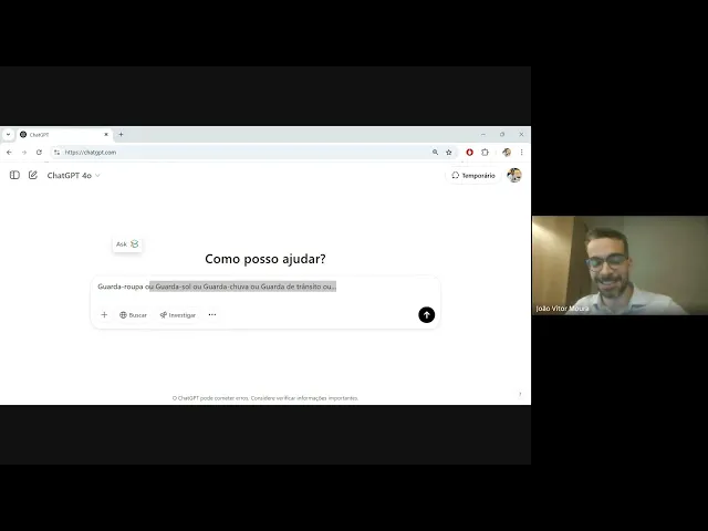 "roupa", ou "guarda-sol", ou "guarda-chuva", ou "guarda de trânsito", ou qualquer outra perspectiva. Então, ele começa a fazer associações entre as palavras, e passa a fazer essas associações de forma estatística ou calculada. Ou seja, ele começa a adivinhar qual é a próxima palavra, e assim vai construindo os textos que apresenta para a gente. O que ele faz chamamos de generalização de padrões e um cálculo estatístico dos possíveis resultados. Então, imaginem, se estou falando que estou andando na rua e que do nada começou uma... Grande chuva, ele provavelmente vai associar com a palavra "guarda" e com a