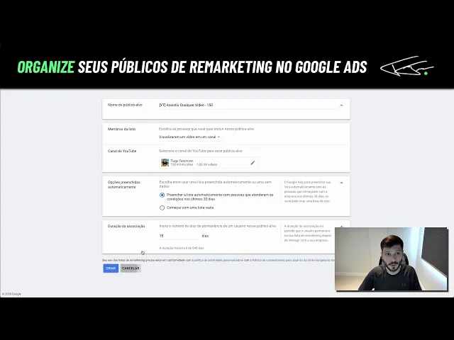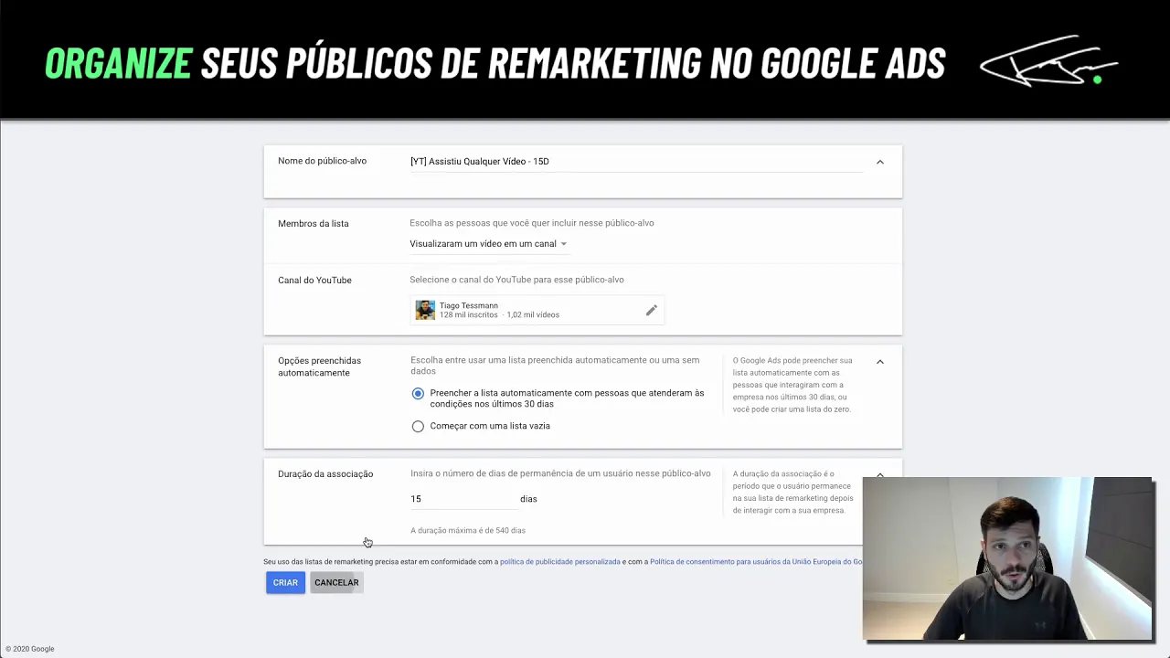 e mesmo que você não for utilizar o público agora você tem que criar nos principais períodos os que utiliza aqui são 540 dias 180 90 60 30 e 15 então por exemplo inscritos quem se inscreveu no meu canal os últimos 15 dias 30 dias 60 dias 90 dias e 180 e 540 dias mesmo que eu não te dizia alguns agora tá lei criado por quê porque o público the remarks tem que criar antes mesmo de pensar em criar campanha eu posso criar um público hoje utilizar só ano que vem porque enquanto o público tá criado